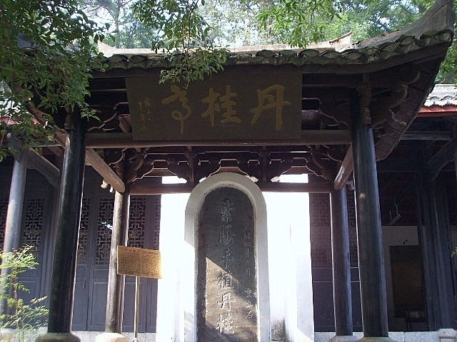 丹桂亭,在院的中部,建于长方形台基上,木结构,歇山顶,四斜坡式,四斜坡式,正脊砖砌,四挑檐,四木柱去撑,斗拱上托,花岗岩圆鼓式柱础,素面。中立“紫阳手持丹桂”碑,为岭南曹秉浚书于光绪四年(公元1878年)九月。