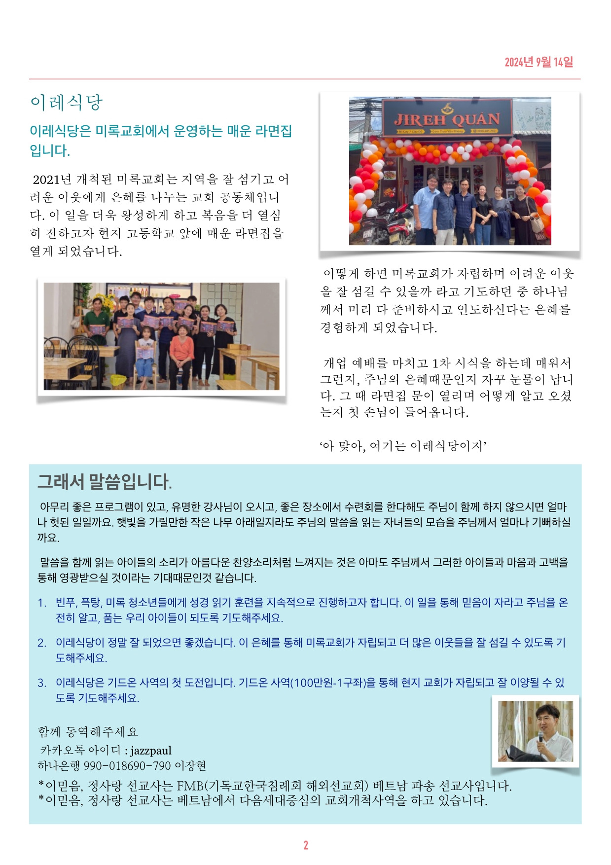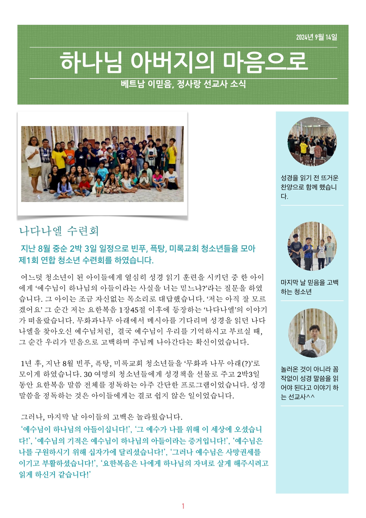 베트남 - 이믿음(정사랑) 선교사 선교편지 (2024년 09월) 작성자부산갈매기|작성시간24.09.21|조회수24 목록 댓글 0 글자크기 작게가 글자크기 크게가 다음검색 현재 게시글 추가 기능 열기 북마크 공유하기 신고 센터로 신고 댓글 댓글 0 댓글쓰기 답글쓰기 댓글 리스트