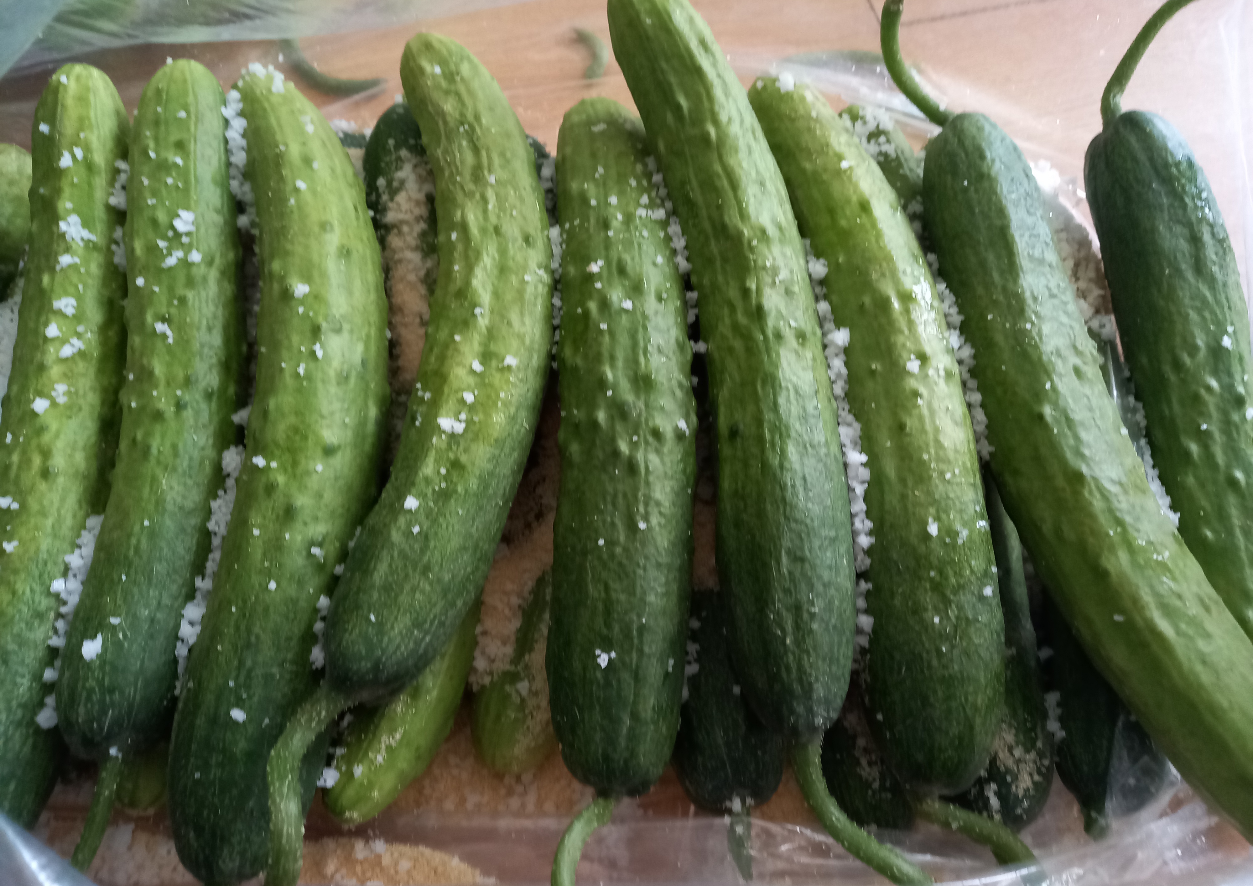 오이 50개에 설탕과 천일염을 한 켜씩 뿌려주고 사과 3배식초 3컵과 소주 반 컵 만 넣어 주면 끝이랍니다.