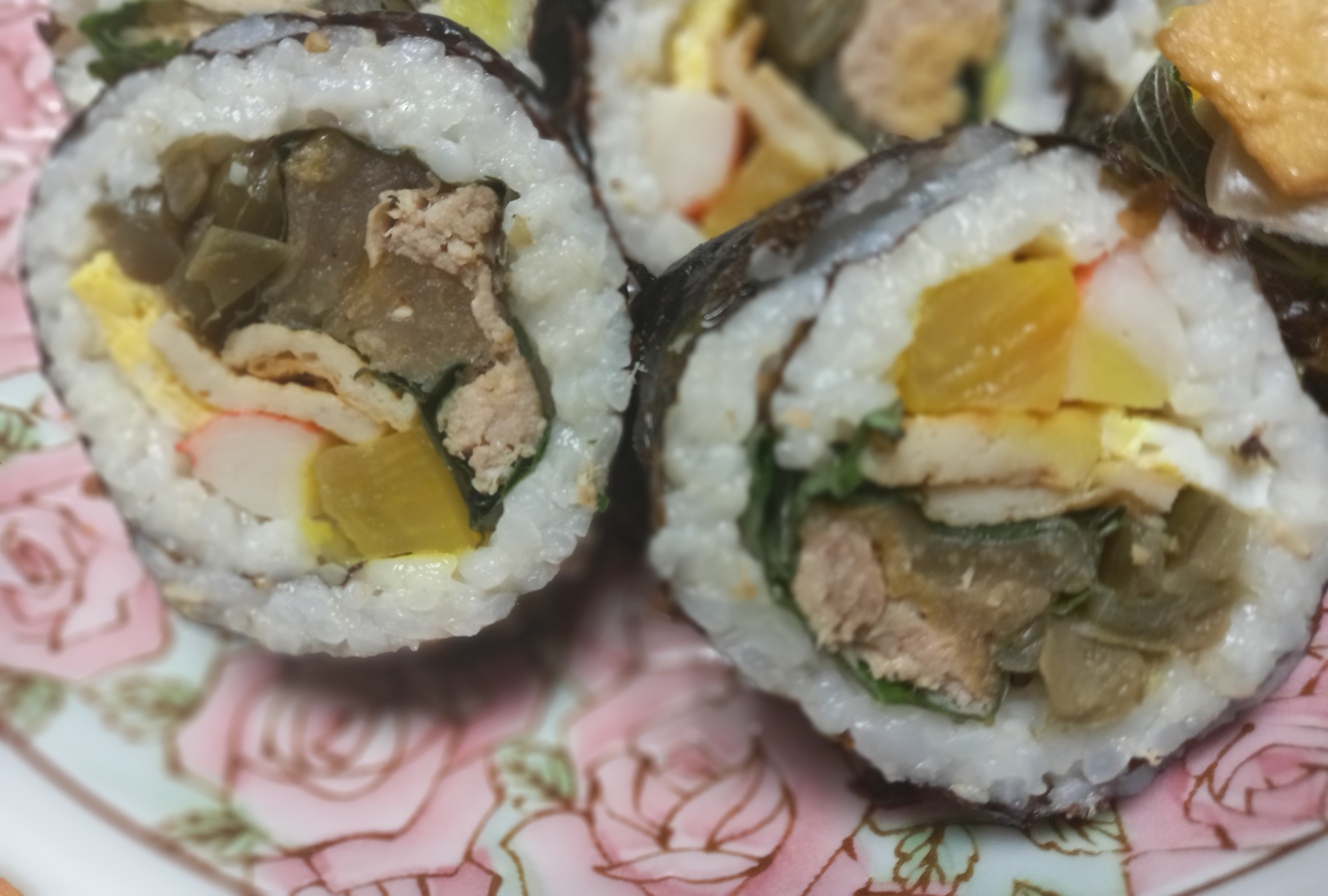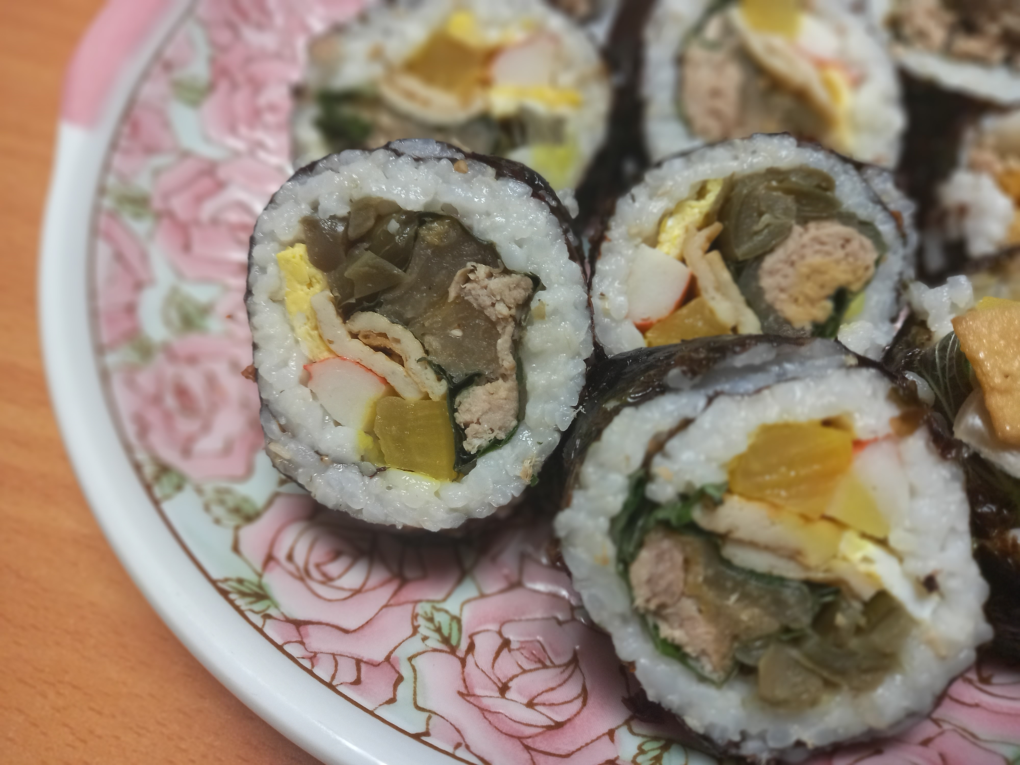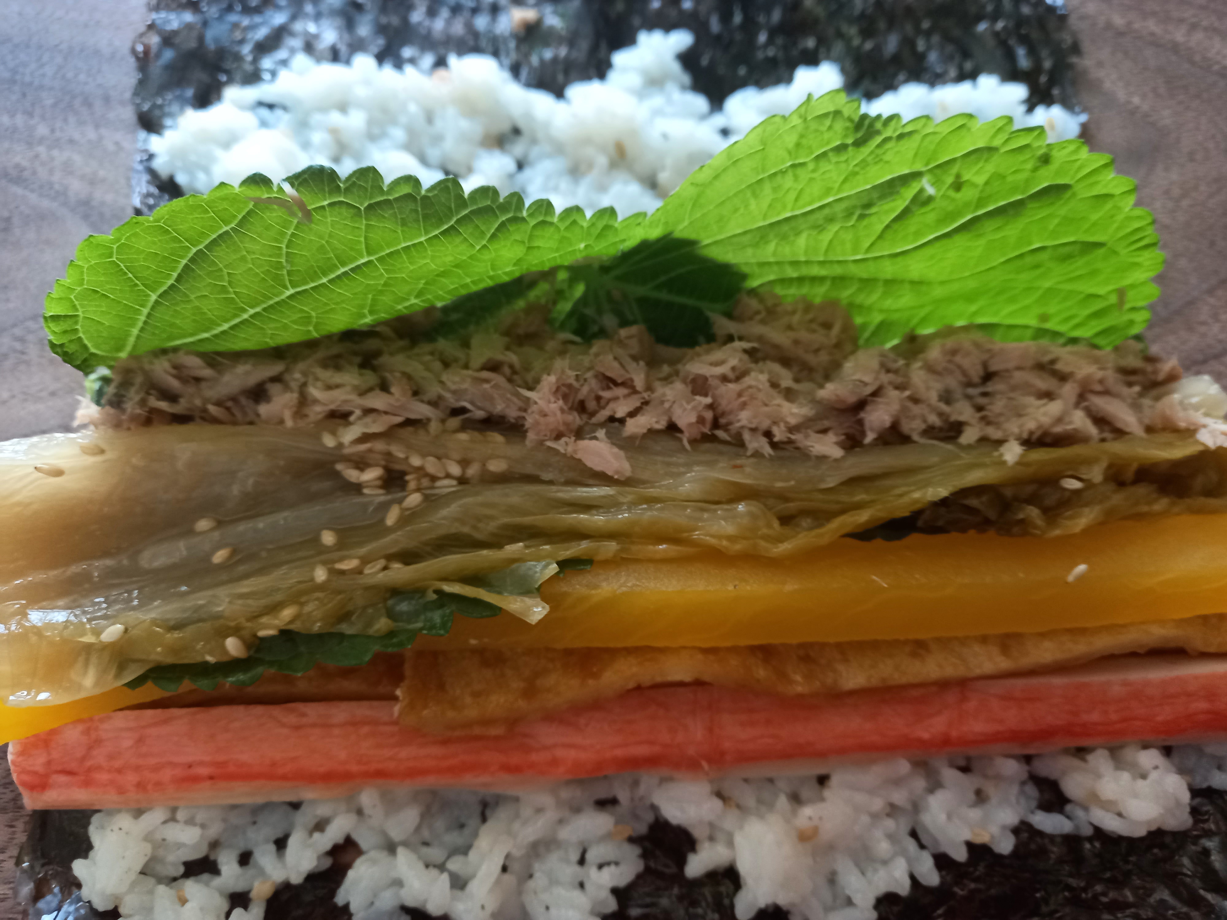 김, 할라피뇨피쿨, 단무지, 계란, 게맛살, 묵은지, 깻잎, 참,들기름. 원당, 통깨, 참치켄,