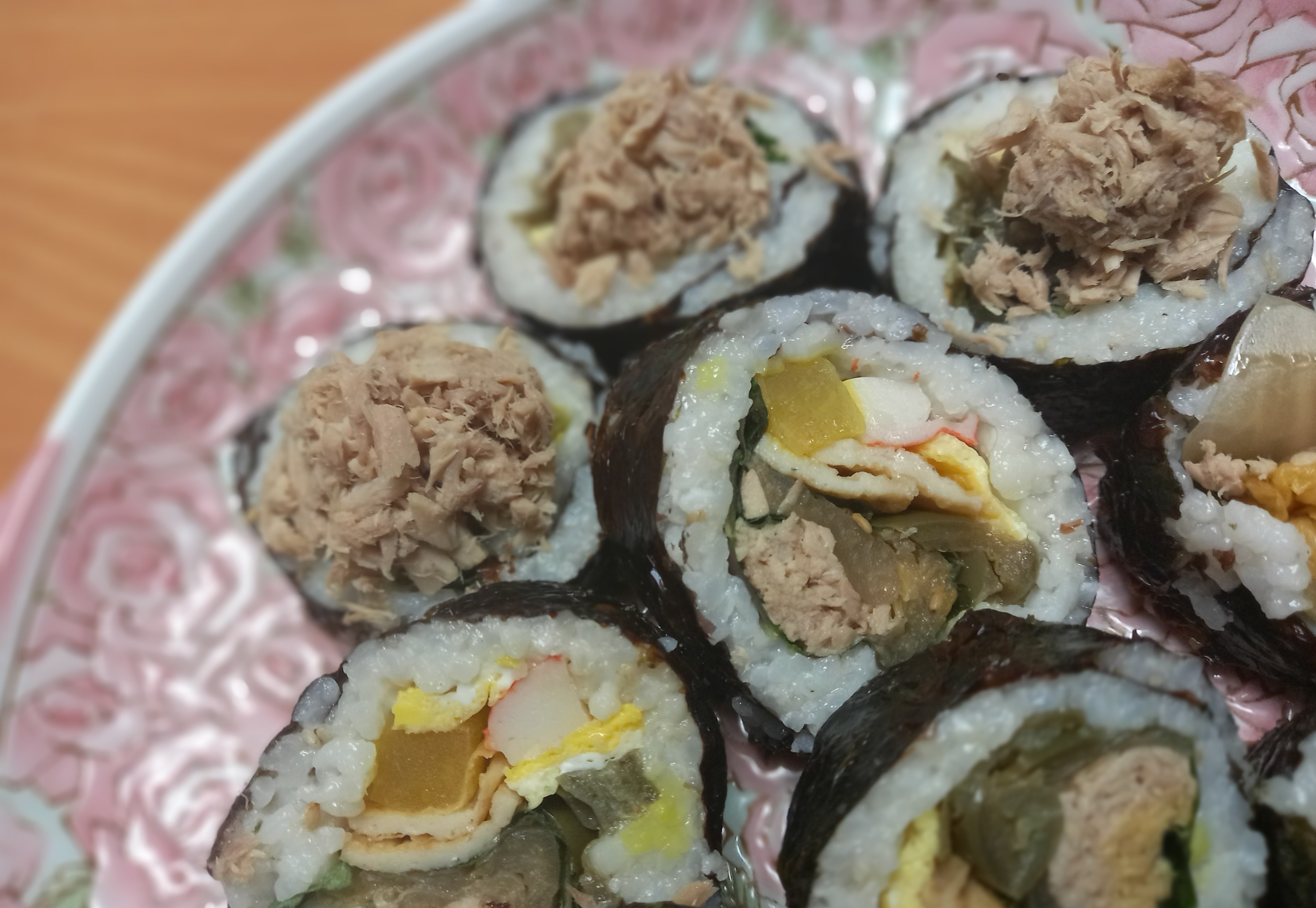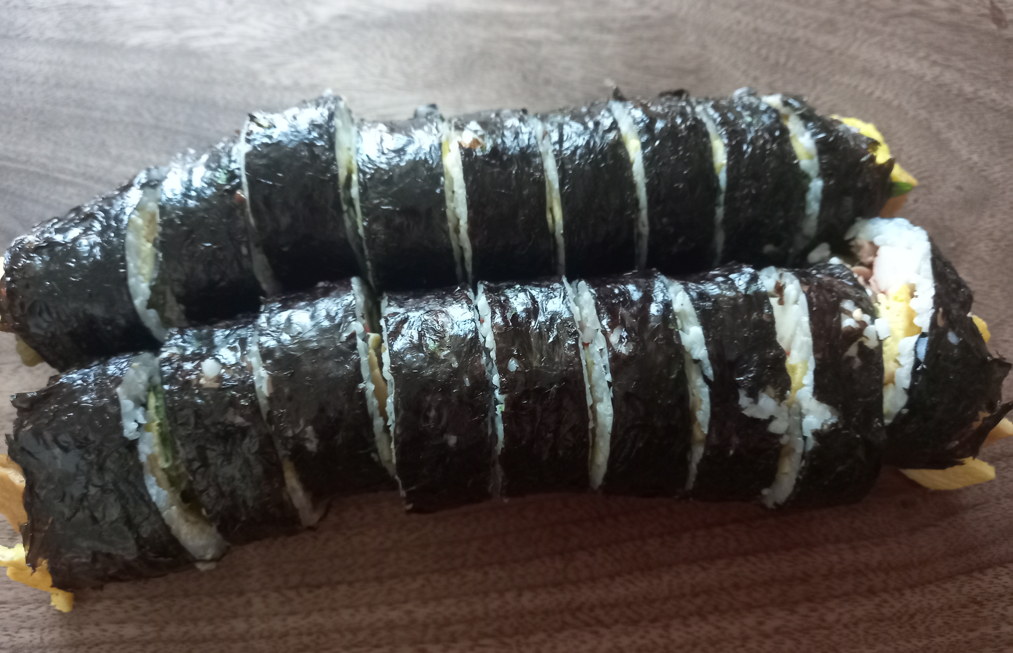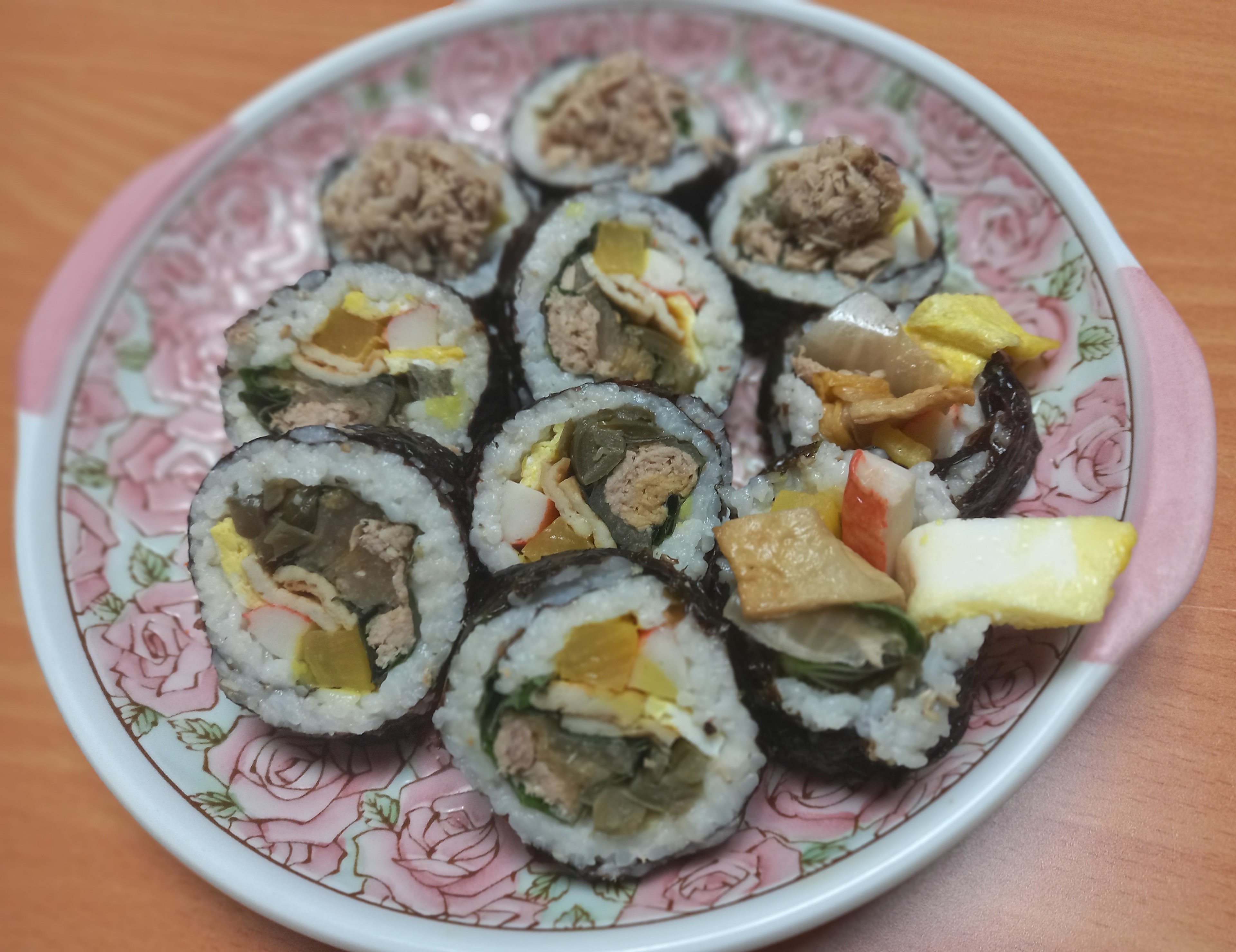 김, 할라피뇨피쿨, 단무지, 계란, 게맛살, 묵은지, 깻잎, 참,들기름. 원당, 통깨, 참치켄,