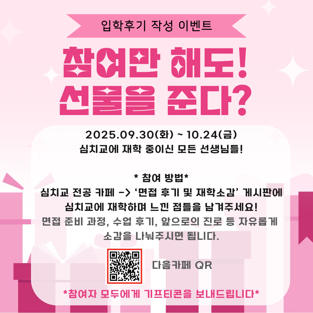 저희 전공에 입학을 고려하시는 예비 신입생 선생님들께 도움이 되는 정보를 제공드리고, 더불어 카페 활성화를 위해 본 이벤트를 진행하고자 합니다.