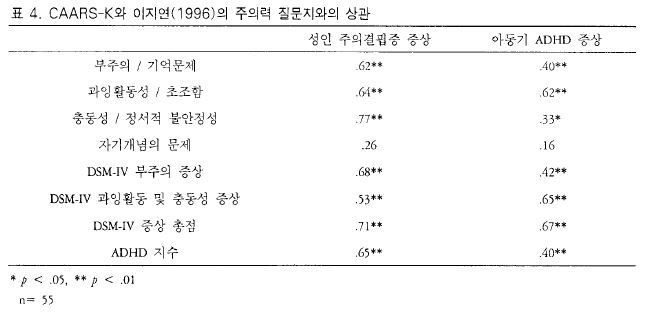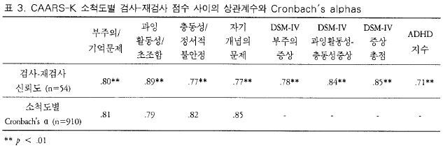 CAARS-K의 각하위 척도는 내적 일치도가 모두 양호하였고, 검사-재검사 신뢰도도 비교적 높게 나타났다. 또한 `자기개념의 문제` 척도를 제외한 모든 하위척도는 성인기 주의력결핍 증상과 아동기 ADHD 증상을 측정하는 기존의 척도와도 유의미한 정적 상관을 보였다. 요인 분석 결과, 3개의 구성 요인이 채택되었으며, 이 요인 구조는 전체 분산의 34.2%를 설명하였다. 각 요인은 `정서적 문제`, `과잉 활동성 및 충동성`, `관리 기능상의 문제`로 명명되었다.