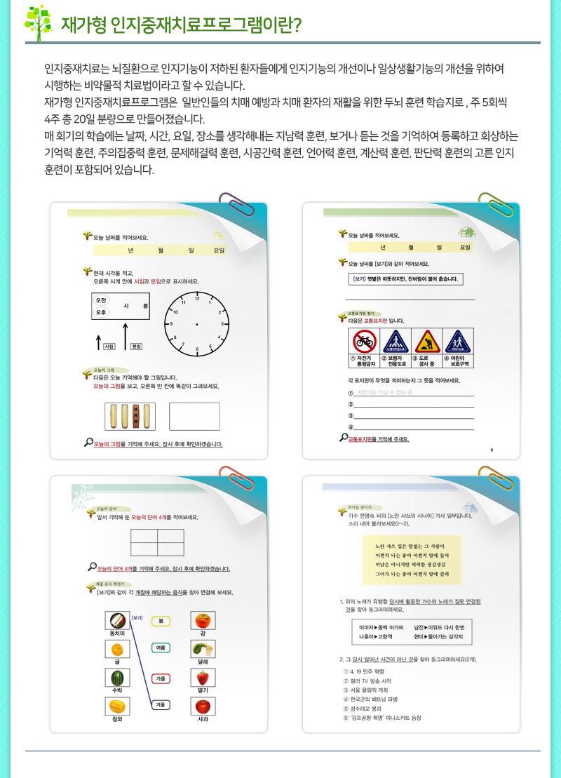 재가형 인지중재치료프로그램은 치매 환자의 재활과 일반인들의 치매 예방을 위한 두뇌 훈련 학습지로