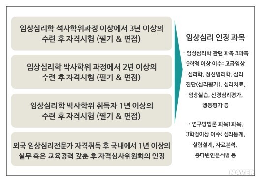 국내에 임상 심리 분야와 관련된 자격 제도에는 한국심리학회 및 한국임상심리학회에서 공동 시행하는 임상심리전문가, 보건복지부에서 시행하는 정신보건임상심리사(1급, 2급) 및 산업인력공단에서 시행하는 임상심리사 등이 있으며 각 자격의 특징은 다음과 같다(표 3).