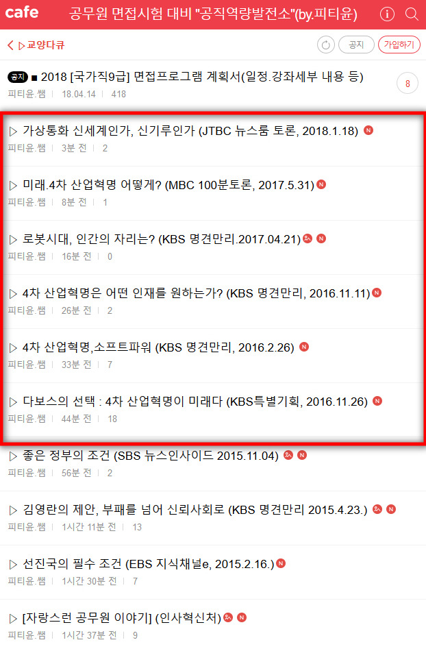 그간 카페 게시판에 수시로 올리다보니 여기저기 흩어진 시사다큐 프로그램들을 갈무리해 모았습니다. 1차분으로 공직관 관련 좋은 다큐 및 공직사회에서도 가장 "핫"한 ‘4차 산업혁명’ 관련 다큐를 올렸습니다. 4차 산업혁명 같은 대형 토픽은 ‘백글이 불여일견’, 엄선된 시사/다큐 프로그램 한 편이 책 한 권보다 효과적입니다.