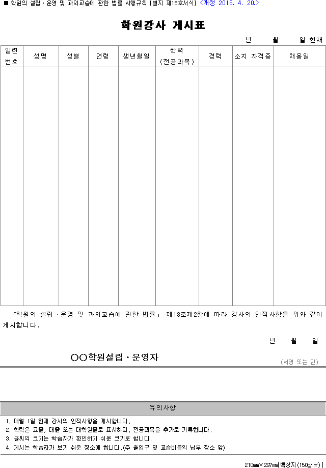 학원설립·운영자는 강사의 연령·학력·전공과목 및 경력 등 강사의 인적사항을 적은 학원강사 게시표(「학원의 설립·운영 및 과외교습에 관한 법률 시행규칙」 별지 제15호서식)를 학습자가 보기 쉬운 장소에 게시해야 합니다(「학원의 설립·운영 및 과외교습에 관한 법률」 제13조제2항 및 「학원의 설립·운영 및 과외교습에 관한 법률 시행규칙」 제10조).