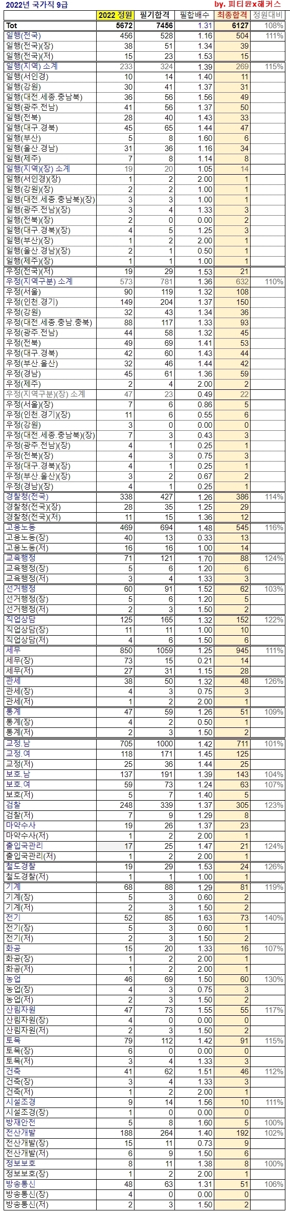 모집정원 대비 일반행정 111%, 우정 110%, 경찰행정 114%, 고용노동 116%, 세무 111%, 관세 126%, 검찰 124% 등입니다. - 정확한 통계는 추후 말씀드리겠지만, 최합인원으로만 봐서는, 국가직9급 최종합격자가 정원보다 역대급으로 많았던 것으로 보입니다.