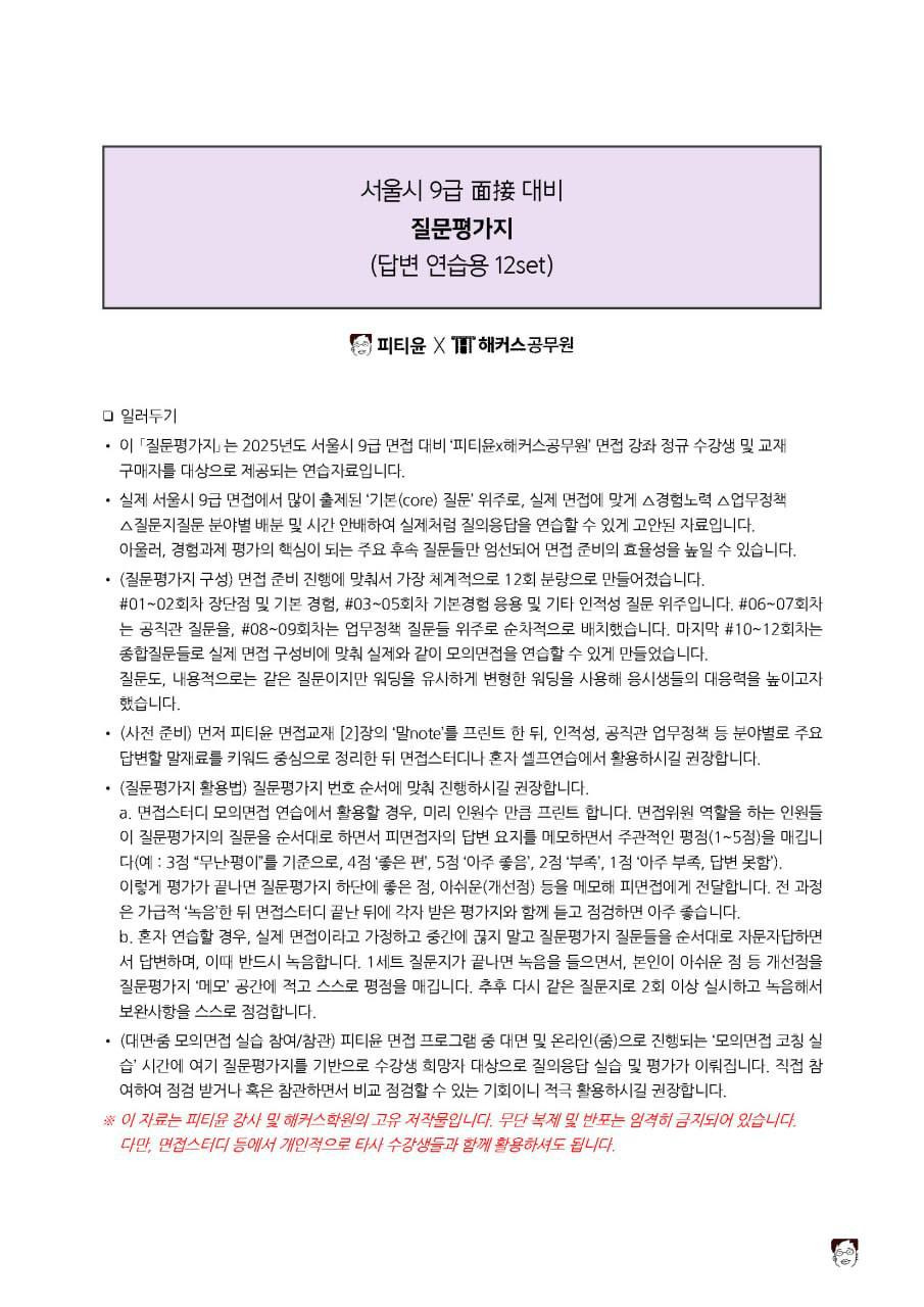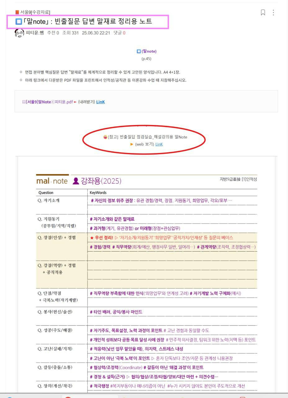 ✅비수강인 경우 … ①교재 구입 후 [서울9] 기출&후기 일독 ②{인적성/공직관/서울시정/전공기출} 등 교재 순서대로 내용 정독하면서 ③교재 수록된 분야별 후기 사례집 참조해 주요 빈출질문을 모은 「말note」에 "단권화" 개념으로 답변 말재료 정리