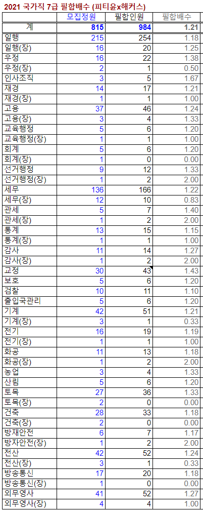 - 직렬별로는, 가장 인원이 많은 일반행정직의 필합배수가 1.18로 예년 통상 1.3배 이상이었던 것에 비해 아주 낮습니다. 동점가가 많았던 것으로 추정됩니다. 그 다음 인원이 많은 세무직도 1.22배로 예년보다 낮은 편입니다.