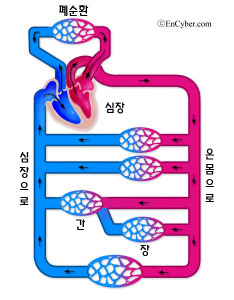 심실의 수축에 의해 혈액이 좌심실에서 대동맥으로 나와 소동맥· 모세혈관을 지나 온몸을 돌면서 산소와 영양분을 조직에 전달하고, 조직세포에서 생긴 이산화탄소와 노폐물을 받아 소정맥·대정맥을 경유하여 우심방으로 돌아오는 순환 경로를 말한다. 소화기 계통에서나온 정맥혈은 문맥(門脈)에 모여 간으로 들어갔다가 다시 모세혈관으로 갈라진 다음 간정맥으로 들어간다. |