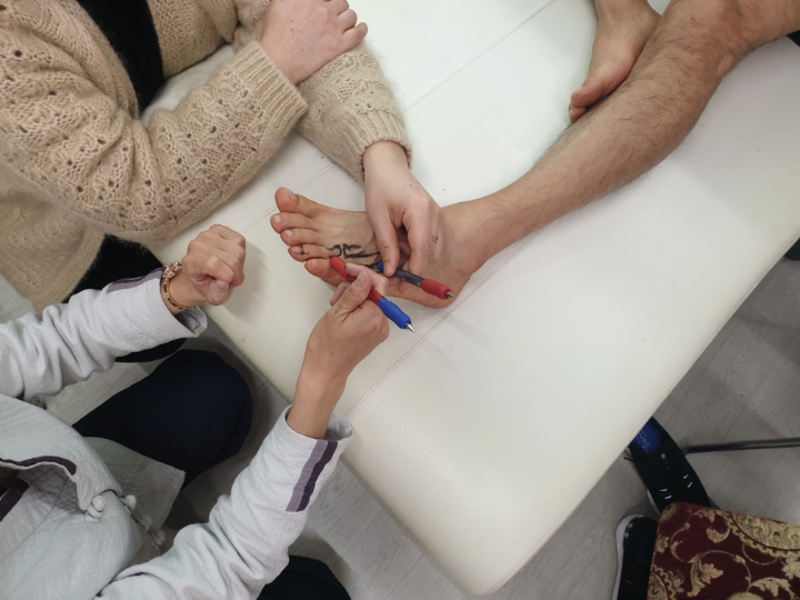무릎 통증을 잡는 다른 방법은 대장,소장, 삼초경맥의 속유주를 따라 상거허, 하거허, 위양을 취혈 하는 방법도 있는데 혈자리를 취혈해도 되지만 헥사비를 이용해서 전경골근을 풀어주는 방법을 선택했네요.