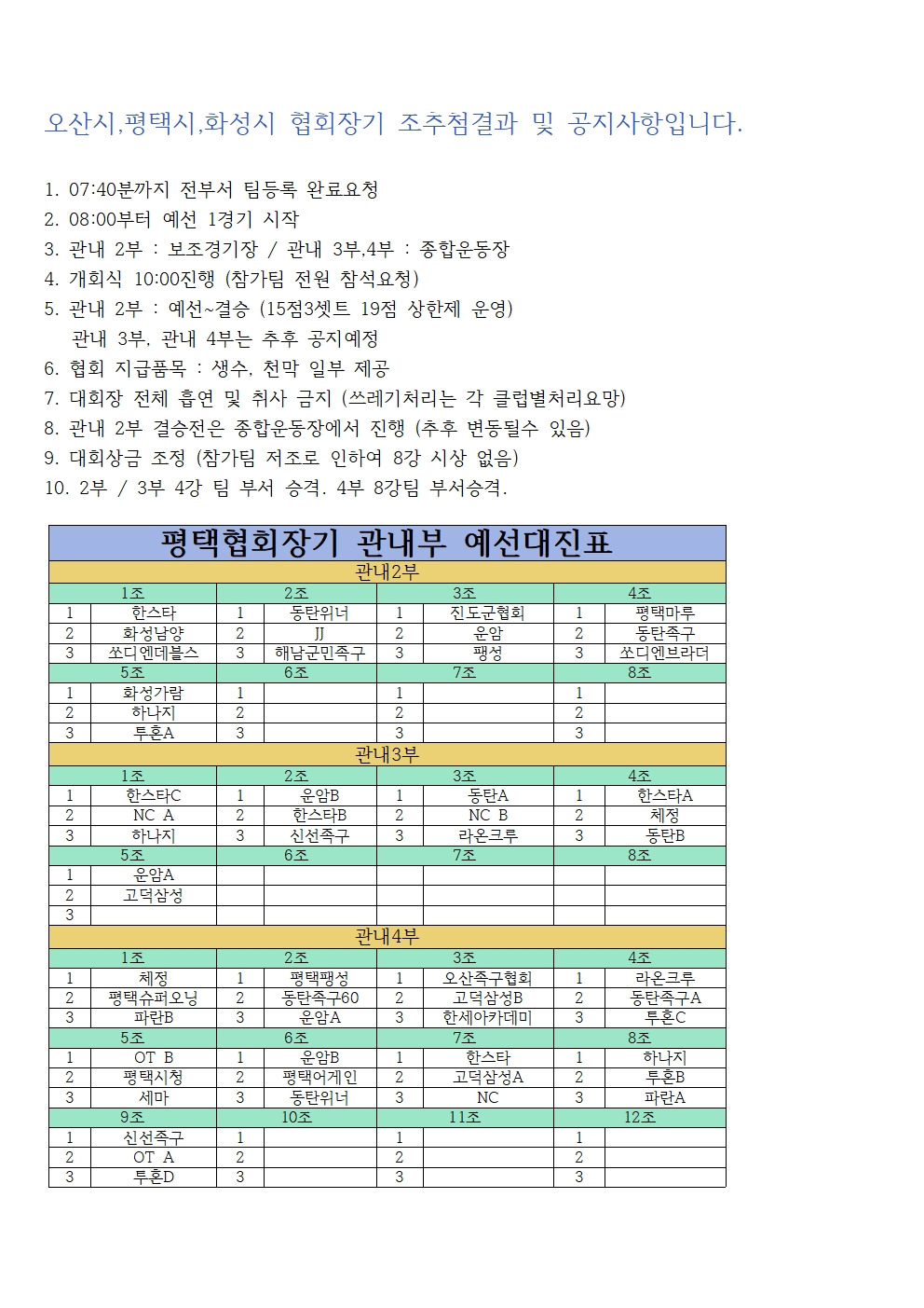오산시, 평택시, 화성시 협회장기 조추첨결과 및 공지사항입니다. 작성자상아|작성시간25.04.25|조회수263 목록 댓글 0 글자크기 작게가 글자크기 크게가 다음검색 현재 게시글 추가 기능 열기 북마크 공유하기 신고 센터로 신고 댓글 댓글 0 댓글쓰기 답글쓰기 댓글 리스트