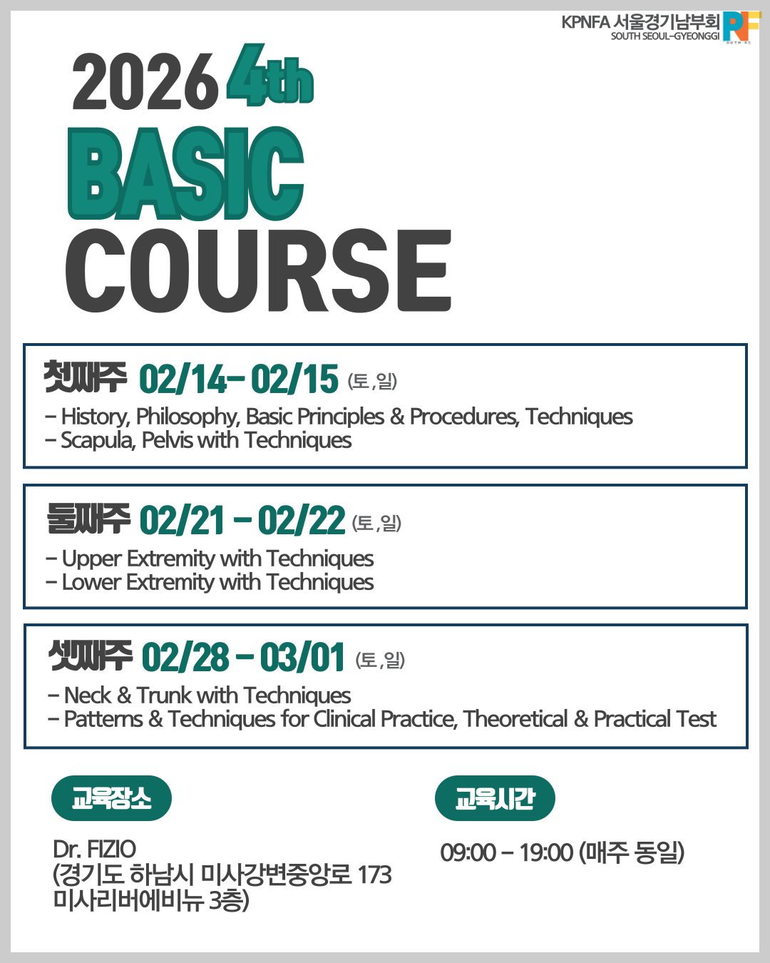안녕하세요. KPNFA 서울·경기남부회에서 2026년도 제4차 Basic Course를 다음과 같이 개최합니다.