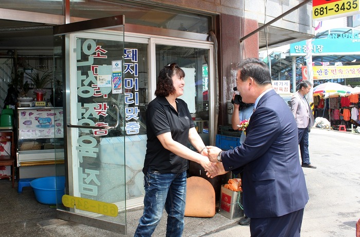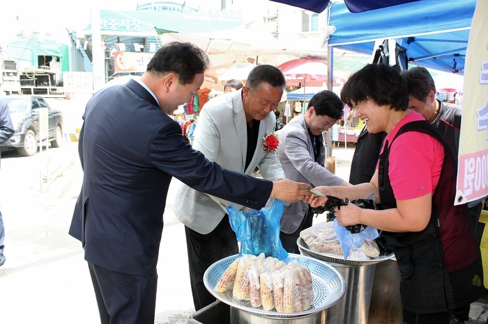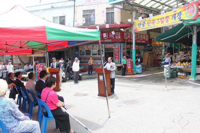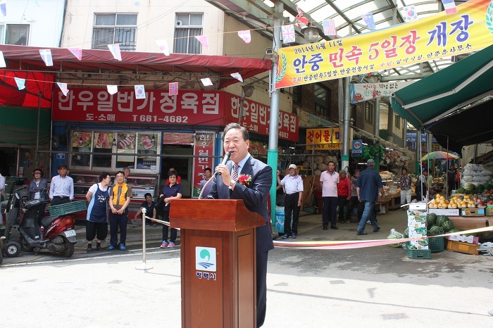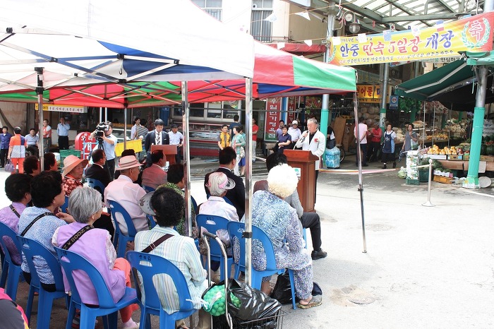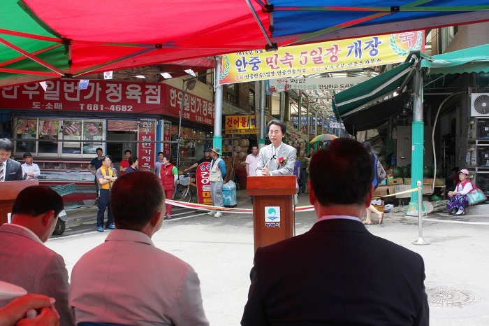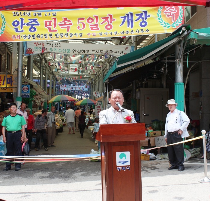 안중전통시장상가번영회(회장 강민모)주최로 열린 민속5일장 개장식엔 김선기 평택시장, 강민모 안중전통시장 번영회장, 김기성, 최중안 평택시의원, 그 밖에 시장번영회 관계자 와 상인, 주민 등 100여명이 참석한 가운데 내빈들의 격려사와 축사, 테이프 컷팅 순으로 진행한 뒤, 시장 내부를 돌아보며 상인들을 격려하고 개장을 축하하는 순으로 진행됐습니다.
