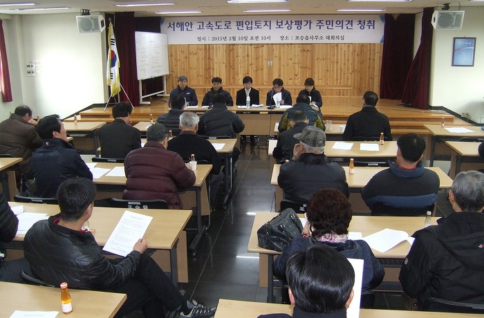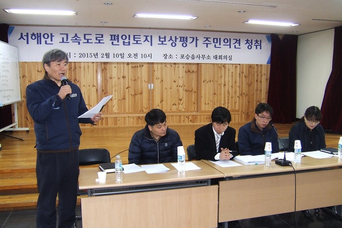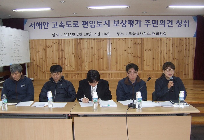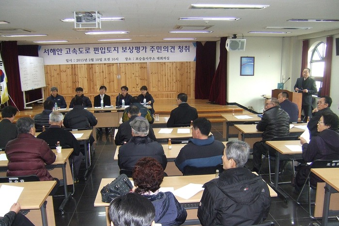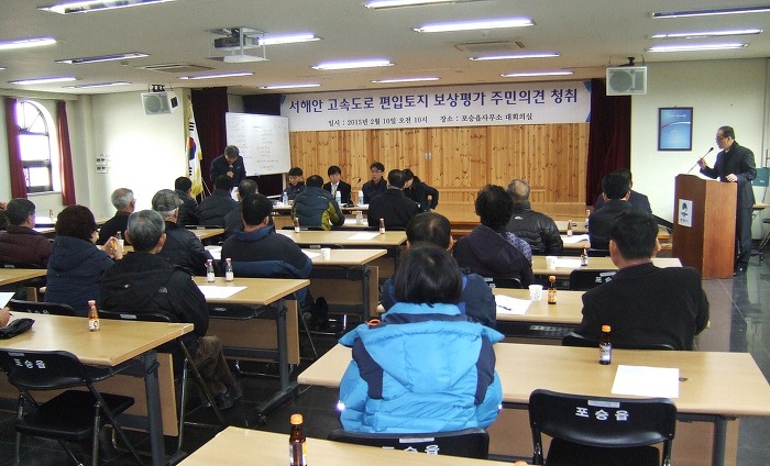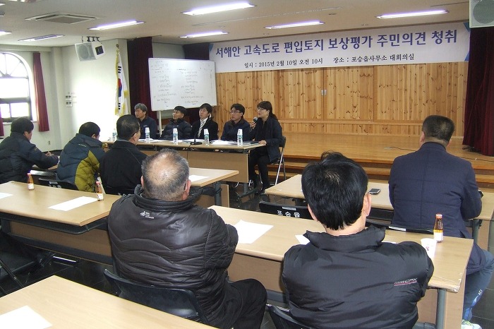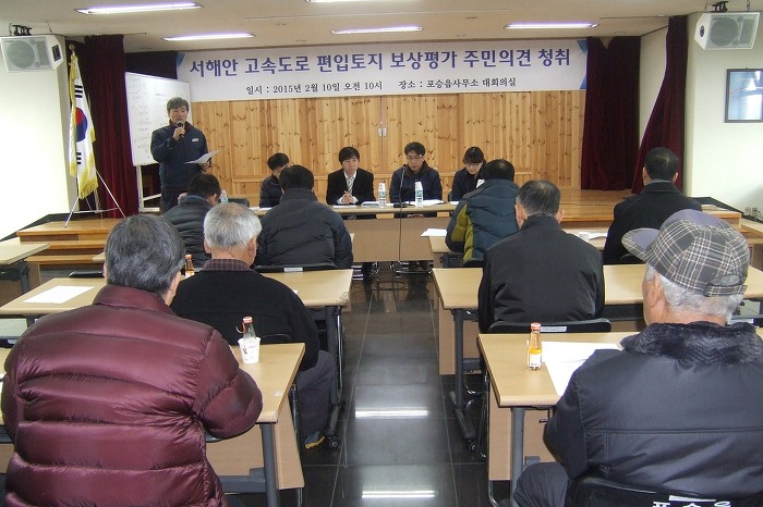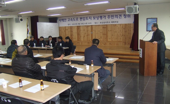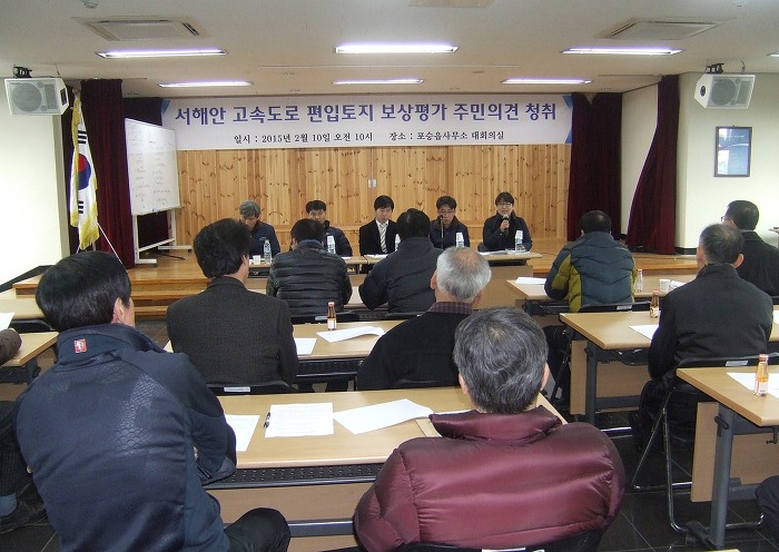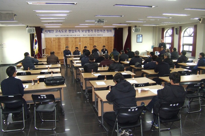 서해안고속도로 평택~서평택 간 확장공사와 관련 보상계획통지(2014. 9. 25)와 신문공고(2014. 10. 1 문화일보), 보강계획 공고 및 열람기간(2014. 10. 1~10. 16)을 거치고, 편입토지 등 물건조사(2014. 11. 10~2015. 1. 26), 토지(임야0대장 등 지적공부 정리 신청(2015. 1. 28)을 마친 한국도로공사 수도권 건설사업단에 해당토지 소유주들의 강력한 요청에 의해 주민의견청취를 위한 설명회가 마련되었으며, 토지소유주들의 아래와 같은 요구사항이 있었습니다.