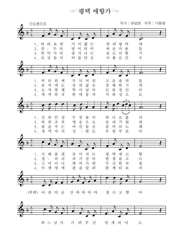 평택 애향가 작성자산움물[홍성범]|작성시간16.03.08|조회수663 목록 댓글 0 글자크기 작게가 글자크기 크게가 평택애향가남여혼성곡.mp3 평택을 노래한 "평택 애향가" 라는 노래입니다. 첨부파일첨부된 파일이 2개 있습니다. jpg 파일 평택애향가.jpg 다운로드 mp3 파일 평택애향가남여혼성곡.mp3 다운로드 다음검색 현재 게시글 추가 기능 열기 북마크 공유하기 신고 센터로 신고 댓글 댓글 0 댓글쓰기 답글쓰기 댓글 리스트