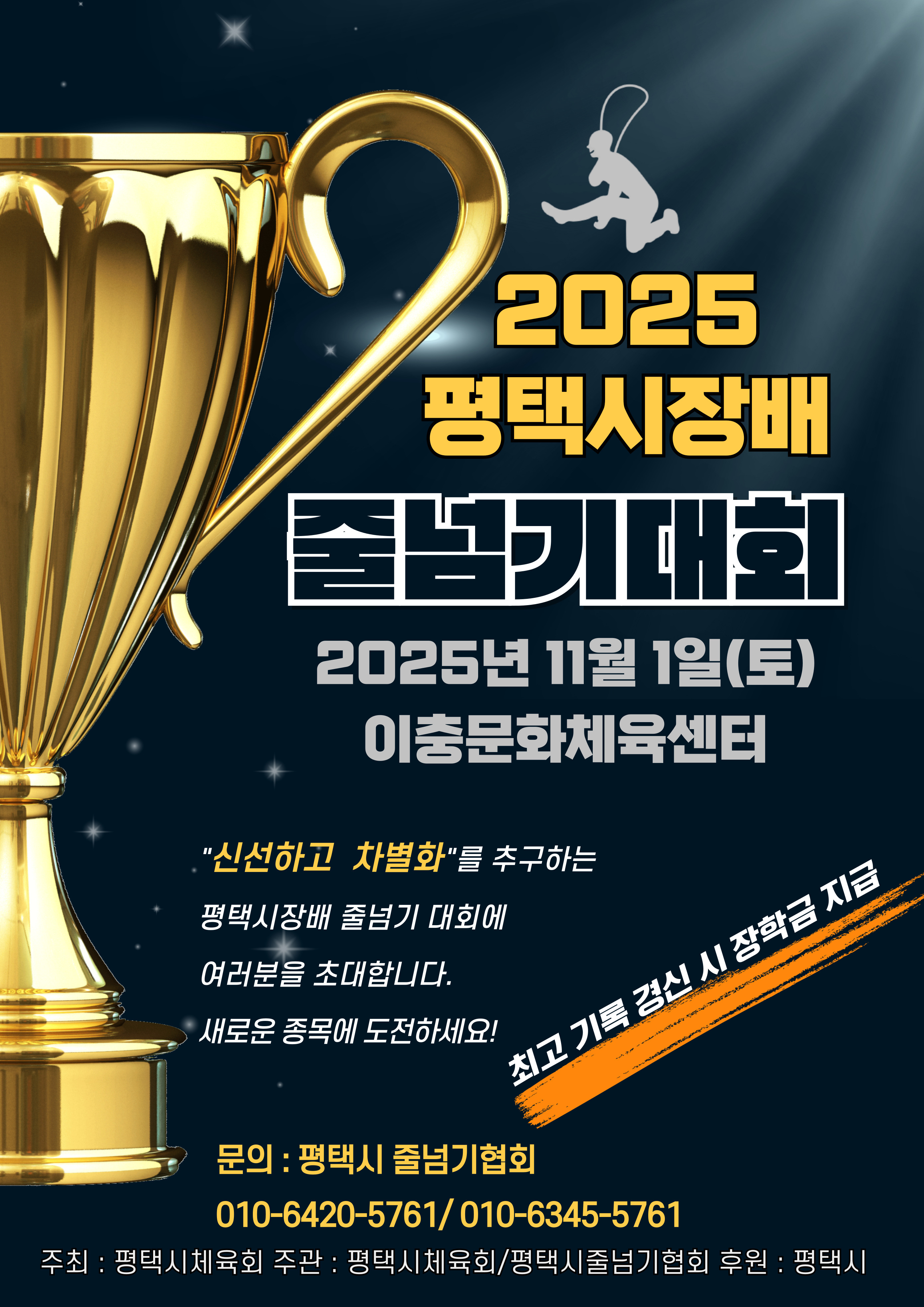 2025 평택시장배 줄넘기대회 작성자이인재|작성시간25.09.15|조회수330 목록 댓글 0 글자크기 작게가 글자크기 크게가 1. 대회요강.hwp622.50KB2. 참가신청서(단체명) - 예시.xlsx14.83KB3. 참가신청서(단체명).xlsx14.54KB 첨부파일첨부된 파일이 4개 있습니다. jpg 파일 대회 포스터.jpg 다운로드 xlsx 파일 3. 참가신청서(단체명).xlsx 다운로드 xlsx 파일 2. 참가신청서(단체명) - 예시.xlsx 다운로드 hwp 파일 1. 대회요강.hwp 다운로드 다음검색 현재 게시글 추가 기능 열기 북마크 공유하기 신고 센터로 신고 댓글 댓글 0 댓글쓰기 답글쓰기 댓글 리스트