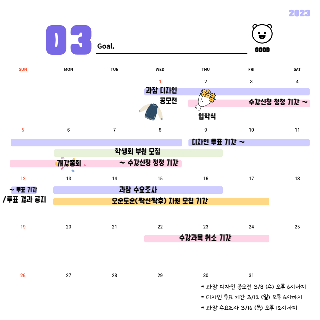 3월 캘린더 제작 작성자22 박건우|작성시간23.03.24|조회수18 목록 댓글 0 글자크기 작게가 글자크기 크게가 행정학과 3월 캘린더를 제작 후 공유했습니다. 다음검색 현재 게시글 추가 기능 열기 북마크 공유하기 신고 센터로 신고 댓글 댓글 0 댓글쓰기 답글쓰기 댓글 리스트