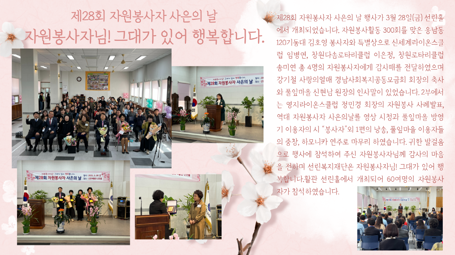 제28회 자원봉사자 사은의 날 - 자원봉사자님! 그대가 있어 행복합니다. 작성자SW 최지유|작성시간25.07.14|조회수55 목록 댓글 0 글자크기 작게가 글자크기 크게가 다음검색 현재 게시글 추가 기능 열기 북마크 공유하기 신고 센터로 신고 댓글 댓글 0 댓글쓰기 답글쓰기 댓글 리스트