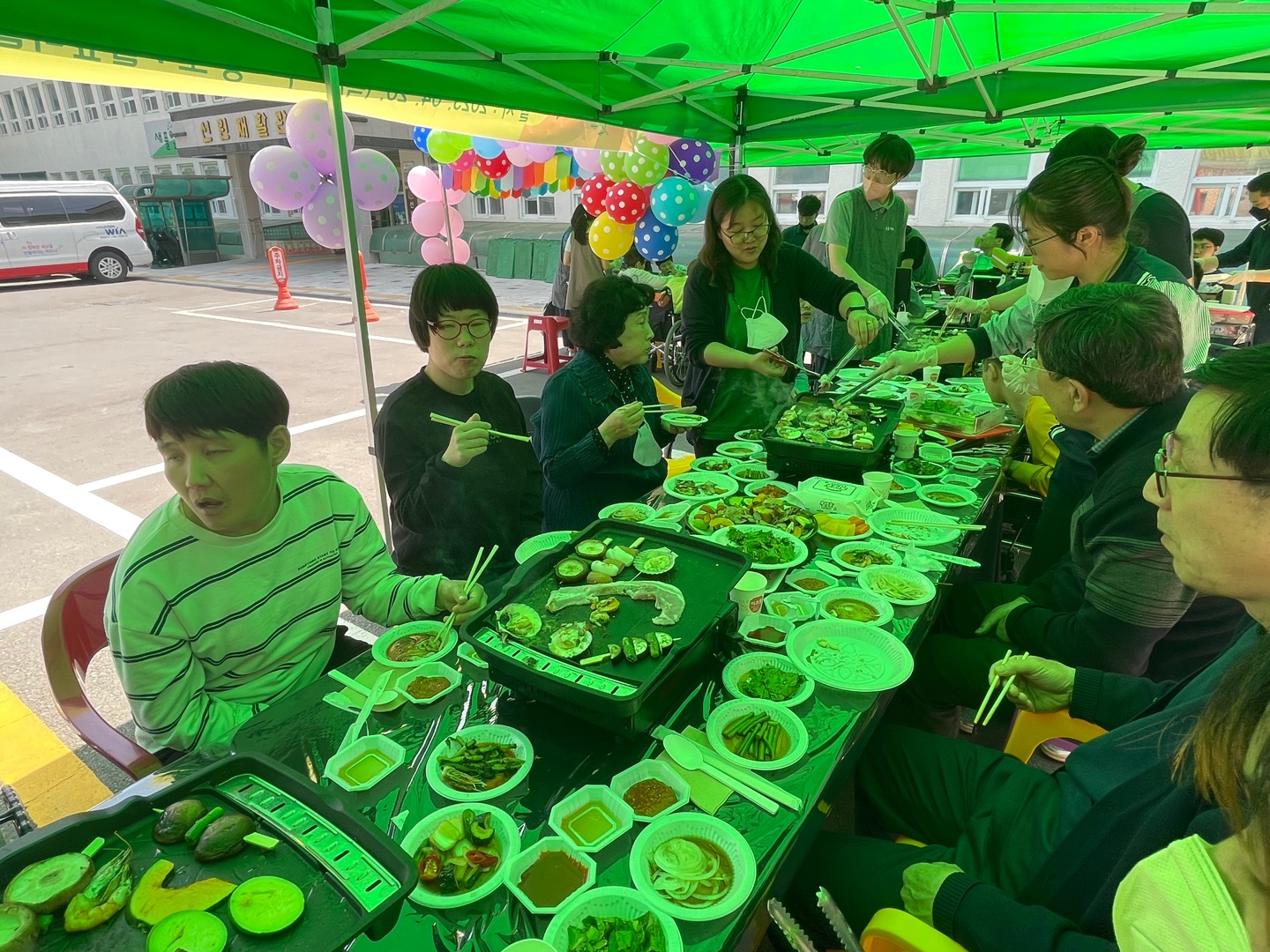 4월 20일(목) 제43회 장애인의날을 맞이하여 풀잎마을 운동장에서 야외캠핑음식을 테마로 먹고 즐기는 신나는 행사를 진행하였습니다. 코로나 이후 아주 오랜만에 많은 이용자와 직원들이 함께 야외에서 삼겹살, 소세지, 가래떡, 조개구이 등을 먹으며 이야기 꽃을 피웠으며 노래자랑대회로 마무리하였습니다.