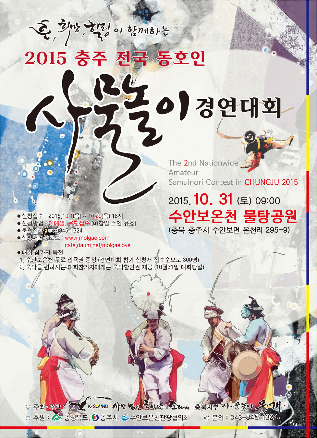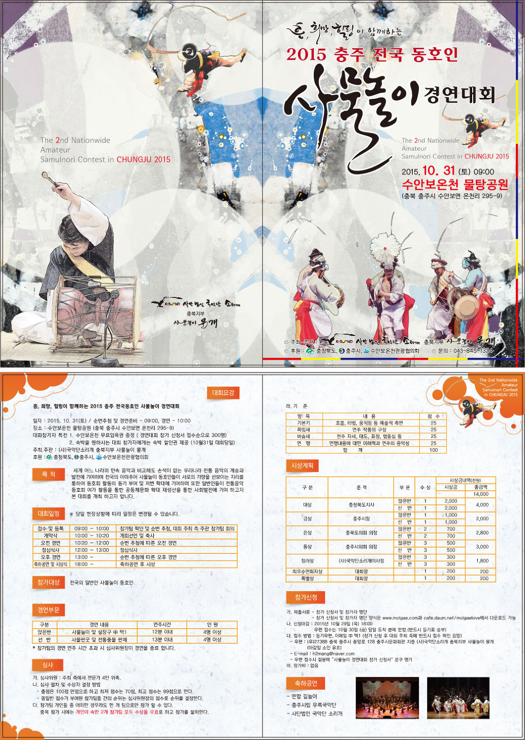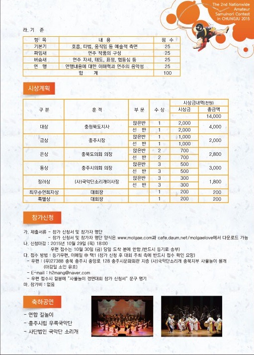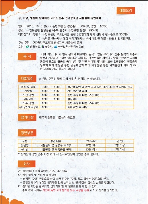 2015 충주 전국 동호인 사물놀이 경연대회 작성자김익수|작성시간15.09.30|조회수45 목록 댓글 0 글자크기 작게가 글자크기 크게가 2015 충주 전국 동호인 사물놀이 경연대회 포스터 및 대회요강 리플렛입니다. 많은 관심부탁드립니다.!!!참가자분들에게 수안보 온천 무료입욕권과 숙박할인권을 드리니 많은 관심부탁들입니다. 다음검색 현재 게시글 추가 기능 열기 북마크 공유하기 신고 센터로 신고 댓글 댓글 0 댓글쓰기 답글쓰기 댓글 리스트