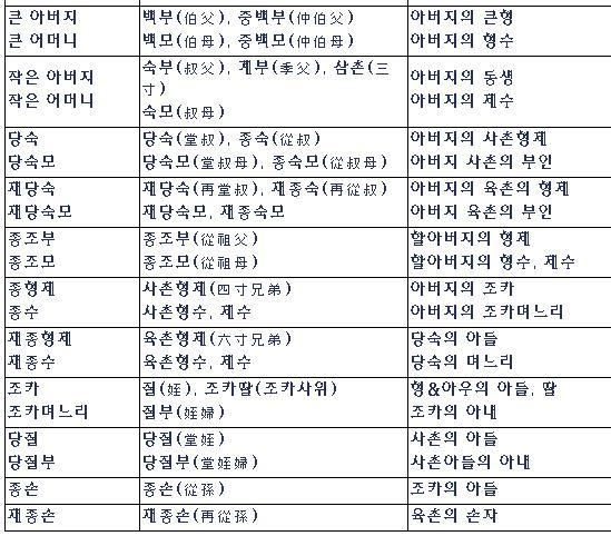아버지의 남자형제는 큰아버지,작은아버지(伯父,叔父=백부,숙부=3촌).