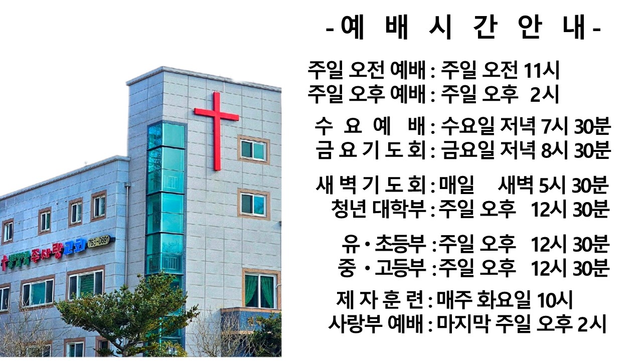 예배 시간 안내 작성자서민승||카페관리|작성시간23.07.18|조회수161 목록 댓글 0 글자크기 작게가 글자크기 크게가 다음검색 현재 게시글 추가 기능 열기 북마크 공유하기 신고 센터로 신고 댓글 댓글 0 댓글쓰기 답글쓰기 댓글 리스트