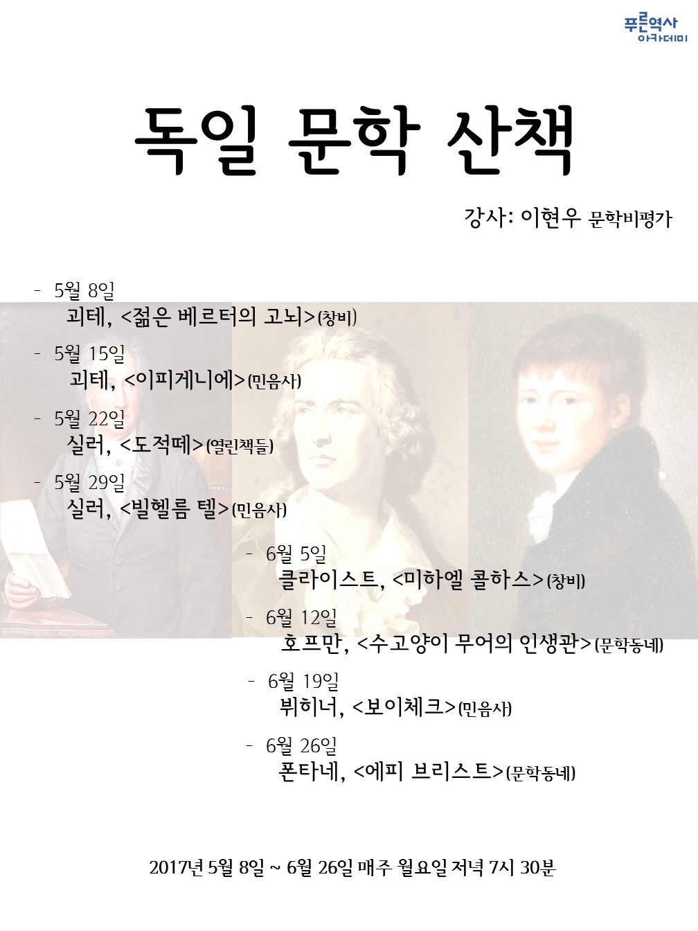 독일 고전주의 문학의 대표 작가 괴테와 실러, 사실주의의 거장 테오도어 폰타네! 혼자는 버겁고, 읽기는 했으나 이해하기 어려웠던 독일 문학을 이현우(로쟈) 문학평론가와 함께 읽어보는 자리를 마련합니다.