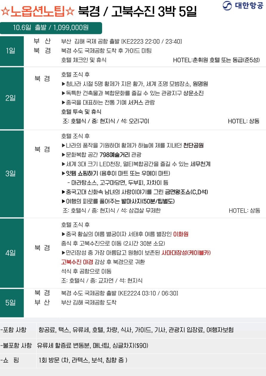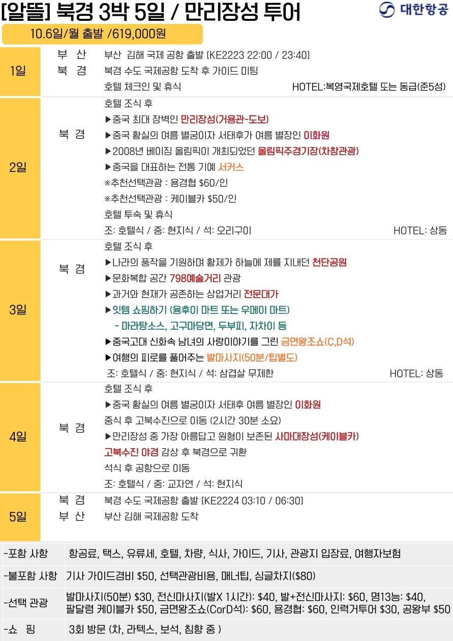 🔹 [알뜰] 북경·만리장성 5일 (대한항공)