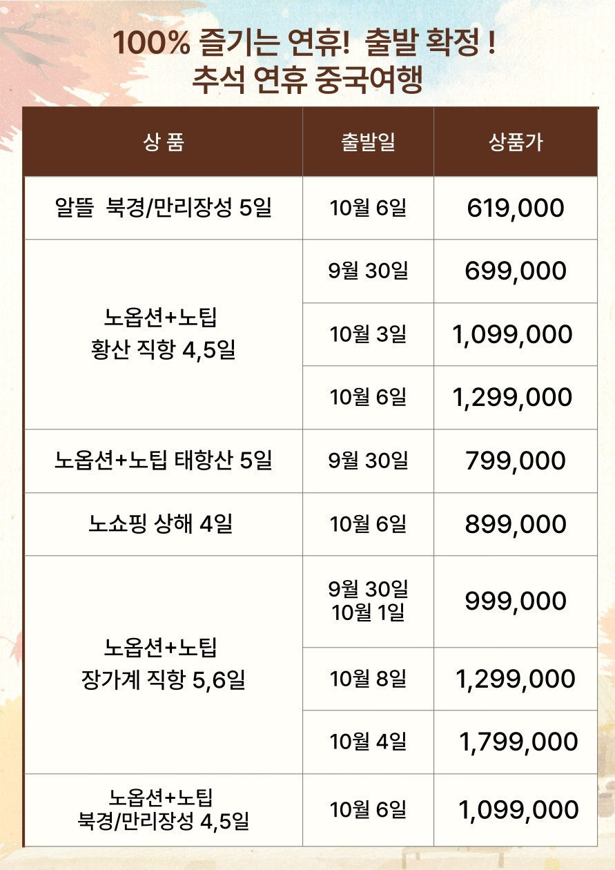 📌 추석연휴 중국 모객 상품