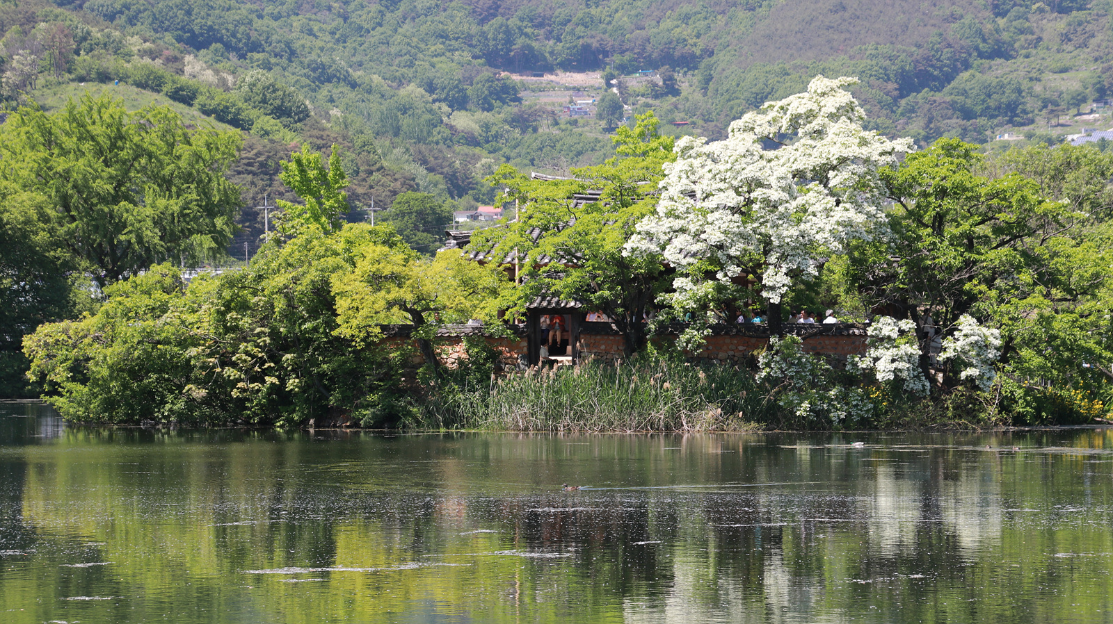 위양지 한쪽에서 바라보는 완재정의 모습은