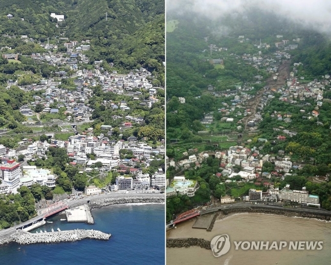 (시즈오카 교도=연합뉴스) 지난 3일 일본 시즈오카(靜岡)현 아타미(熱海)시 이즈산(伊豆山) 지구에서 산사태가 발생한 현장 4일 모습(오른쪽)과 2019년 6월 모습. 2021.7.4 photo@yna.co.kr