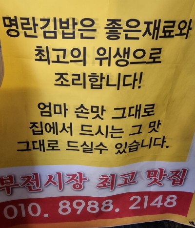 [오늘은 ^^*]부전시장 명란김밥 3,000 원 작성자사자왕|작성시간24.03.12|조회수125 목록 댓글 2 글자크기 작게가 글자크기 크게가 부산 부산진구 중앙대로783번길 23 명란김밥010-8988-214807:30 ~ 20:00라스트 오더 17:30출처 : Naver 다음검색 현재 게시글 추가 기능 열기 북마크 신고 센터로 신고 댓글 댓글 2 댓글쓰기 답글쓰기 댓글 리스트 작성자반가운걸 | 작성시간 24.03.12 작성자한밤의우수 | 작성시간 24.03.12 유명해 지기 전개업 초창기에 한번 먹어봤는데명성에 비해 우수 입맛에는 고만고만 하였네요~~ 댓글 전체보기