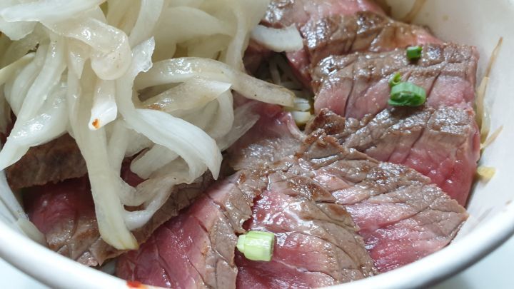 오늘 아침 비행기로 내려 온 아들놈이 뭘 드시겠냐고 묻더니 덮밥집의 메뉴를 보내 왔길래 스테이크를 선택했습니다.
