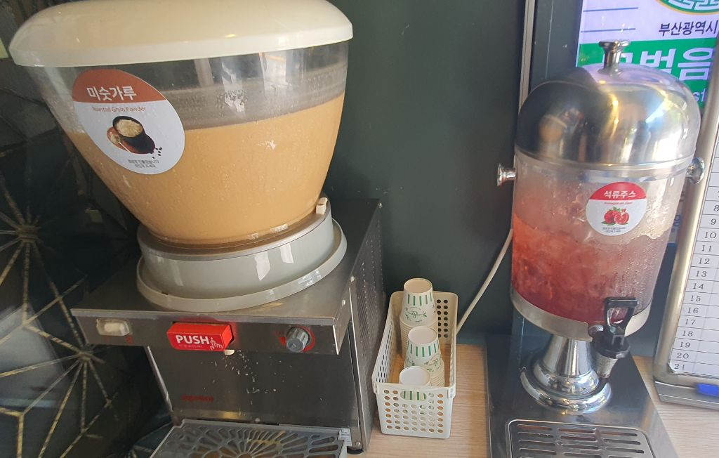 가게 입구에 덥다고 미수가루와 석류쥬스를 대기자에게 제공한다