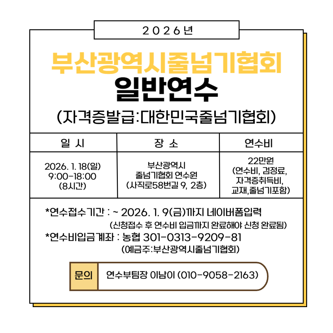 * 장 소 : 부산광역시 줄넘기협회 연수원(사직로58번길9, 2층)