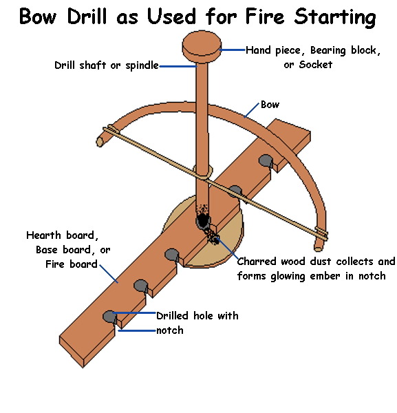 필요 재료 : 곧은 튼튼한 막대(회전용), 굽은 막대 (보우, 활 역할), 회전 축 손잡이 (가급적 마찰력이 없는 재료), 바닥판, 불씨판