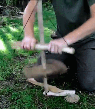 불씨를 만드는 바닥판에 막대를 손으로 비비며 불씨를 만드는 가장 단순한 방법.