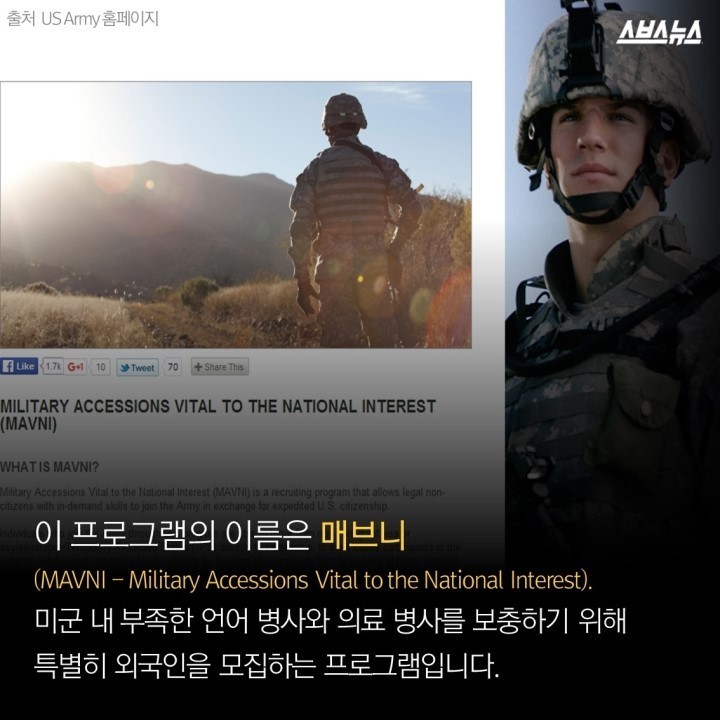 이 프로그램의 이름은 매브니(MAVNI - Military Accessions Vital to the National Interest). 미군 내 부족한 언어 병사와 의료 병사를 보충하기 위해 특별히 외국인을 모집하는 프로그램입니다. 매브니에 뽑히면 적잖은 봉급도 받지만 미국 시민권을 손쉽게 취득할 수 있습니다.