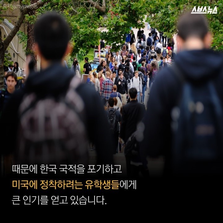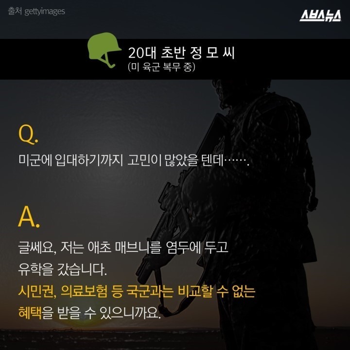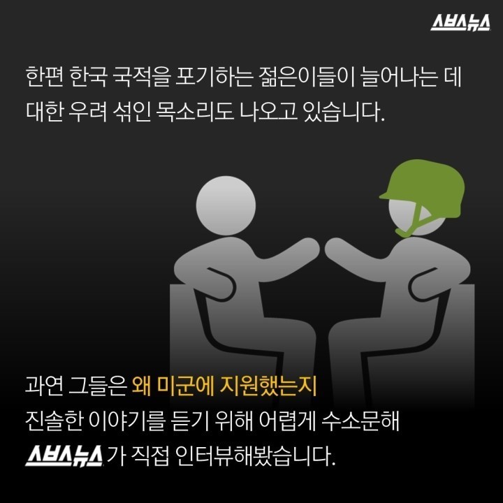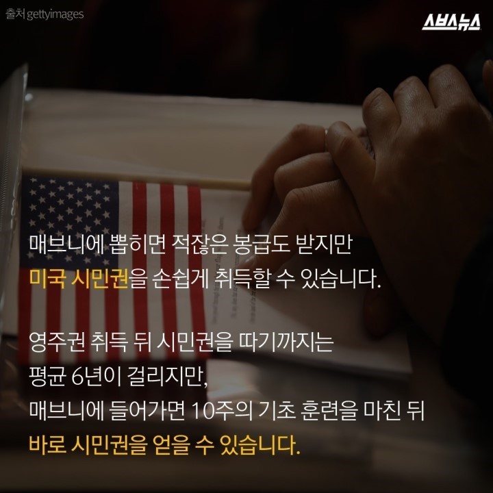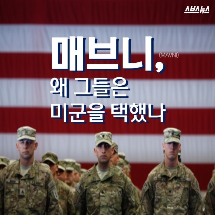 원래 영주권 취득 뒤 시민권을 따기까지 평균 6년이 걸리지만, 매브니에 들어가면 10주의 기초 훈련을 마친 뒤 바로 시민권을 얻을 수 있습니다. 때문에 한국 국적을 포기하고 미국에 정착하려는 유학생들에게 큰 인기를 얻고 있습니다.한편 한국 국적을 포기하는 젊은이들이 늘어나는 데 대한 우려 섞인 목소리도 나오고 있습니다. 과연 그들은 왜 미군에 지원했는지 진솔한 이야기를 듣기 위해 어렵게 수소문해 스브스뉴스가 직접 인터뷰해봤습니다.