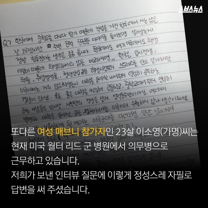 또다른 여성 매브니 참가자인 23살 이소영(가명)씨는 현재 미국 월터 리드 군 병원에서 의무병으로 근무하고 있습니다. 저희가 보낸 인터뷰 질문에 이렇게 정성스레 자필로 답변을 써 주셨습니다.