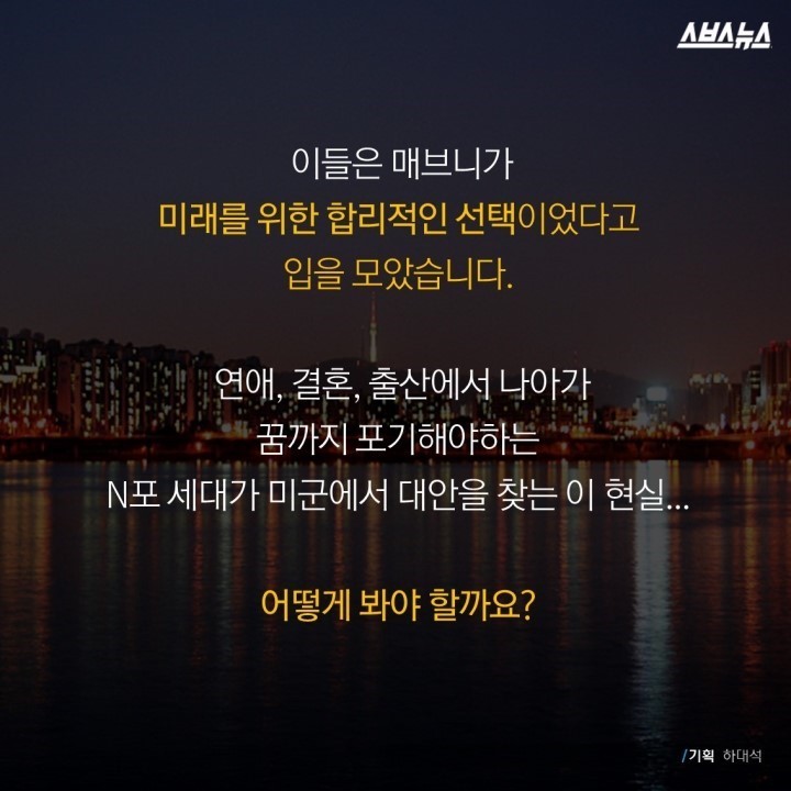 이들은 매브니가 미래를 위한 합리적인 선택이었다고 입을 모았습니다. 연애, 결혼, 출산에서 나아가 꿈까지 포기해야하는 N포 세대가 미군에서 대안을 찾는 이 현실... 어떻게 봐야 할까요?
