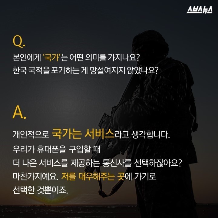 A. 개인적으로 국가는 서비스라고 생각합니다. 우리가 휴대폰을 구입할 때 더 나은 서비스를 제공하는 통신사를 선택하잖아요? 마찬가지예요. 저를 대우해주는 곳에 가기로 선택한 것뿐이죠.