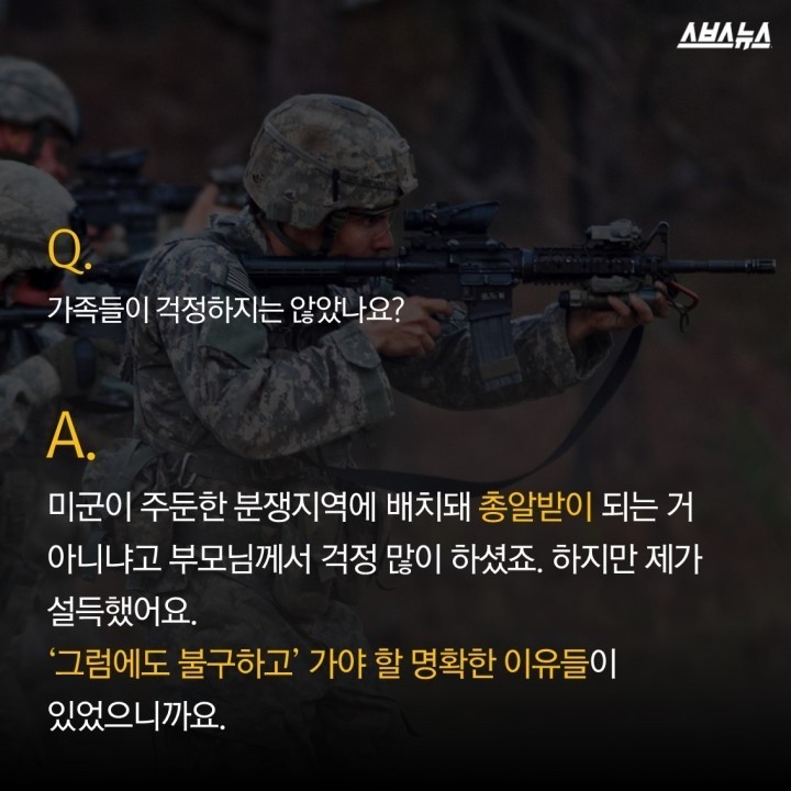 A. 왜 아니겠어요. 미군이 주둔한 분쟁지역에 배치돼 총알받이 되는 거 아니냐고 부모님께서 걱정 많이 하셨죠. 하지만 제가 설득했어요. '그럼에도 불구하고' 가야 할 명확한 이유들이 있었으니까요.