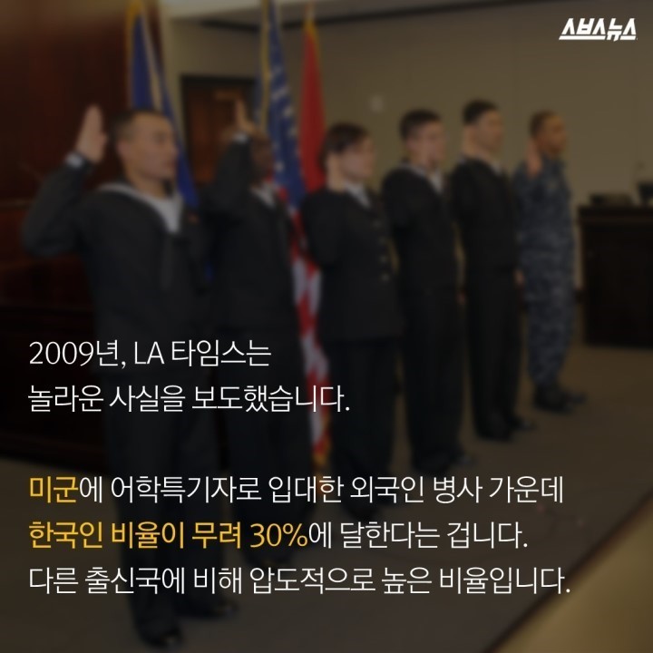 미군에 어학특기자로 입대한 외국인 병사 가운데 한국인 비율이 무려 30%에 달한다는 겁니다. 다른 출신국에 비해 압도적으로 높은 비율입니다.