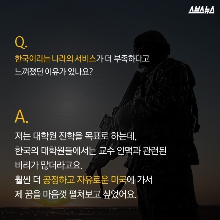 A. 글쎄요, 저는 애초 유학 갈 때부터 매브니를 염두에 두고 갔습니다. 시민권, 의료보험 등 국군과는 비교할 수 없는 혜택을 받을 수 있으니까요.