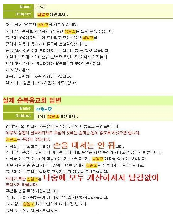 작성자잘살아보세(경기) 작성시간 12.05.15 허~ 참 ! 신앙심의 확인이 언제부터 "십일조"가 되었는지.... "십일조"를 사채업자 일수 받듯이 하네요. 주님께서 통곡하실 사건 입니다.