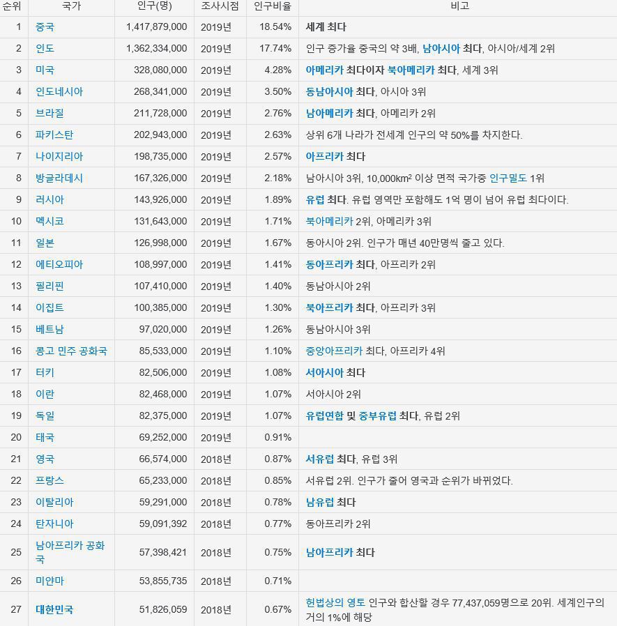 작성자오두막(경기 성남) 작성시간 19.02.19 국가별 인구는 국토면적과 함께 봐야 합니다.