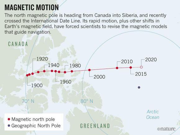 지구의 자북극은 지난해 국제 날짜 변경선 너머로 55km 씩 빨라졌다. 이 속도는 1990년대 중반보다 3배 이상 빠른 것이다. 현재 동반구에 위치한 자북극은 캐나다로부터 멀어지고 시베리아에 가까와지고 있다.